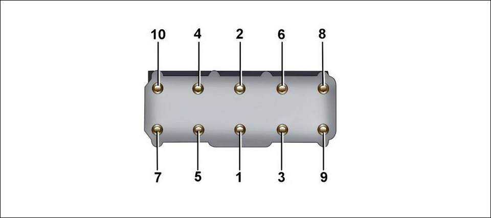 Для обеспечения равномерного и плотного прилегания прокладки к головке блока и на блок цилиндров, затяжку гаек производить в последовательности указанной на рисунке ниже, в два приема. Первый раз — предварительно с меньшим усилием, момент затяжки 5,0-6,5 кгсм, второй раз — окончательно, момент затяжки 9,0-9,5 кгсм.