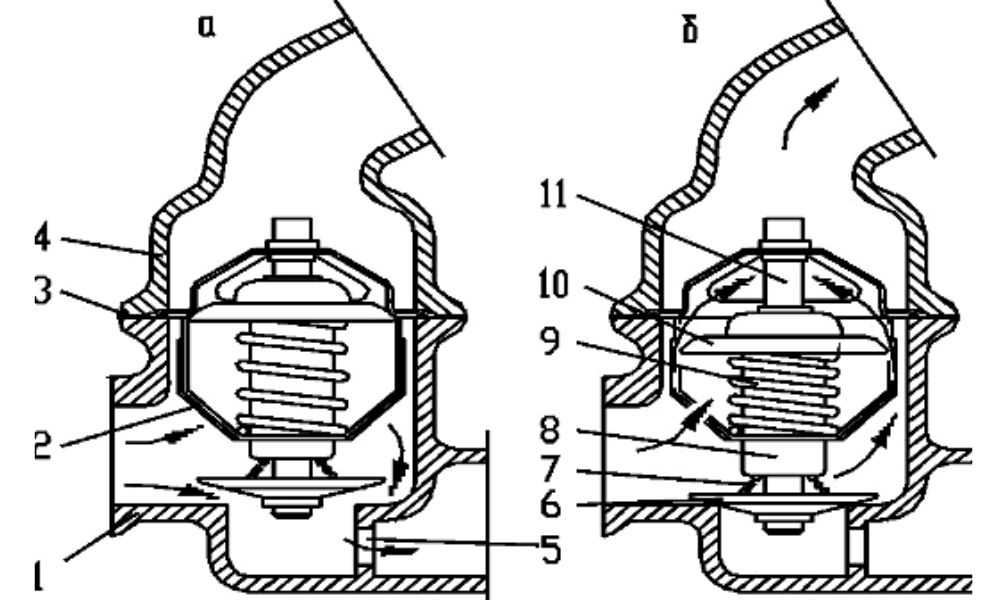 - Если же антифриз, наоборот, слишком остывает, то термостат закрывает большой круг и вновь пускает жидкость по малому.