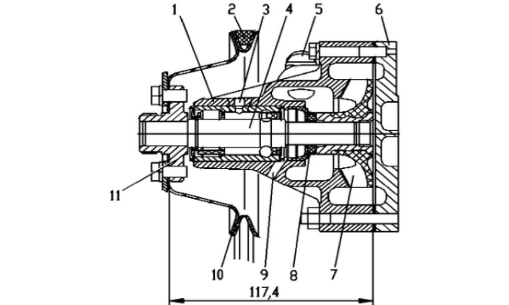 Ступица посажена на вал подшипника с натягом 0,032-0,077 мм (внутренний диаметр ступицы 17 мм). Размер от переднего торца фланца ступицы до заднего торца корпуса водяного насоса без крышки после напрессовки ступицы на вал составляет 117,4 мм.