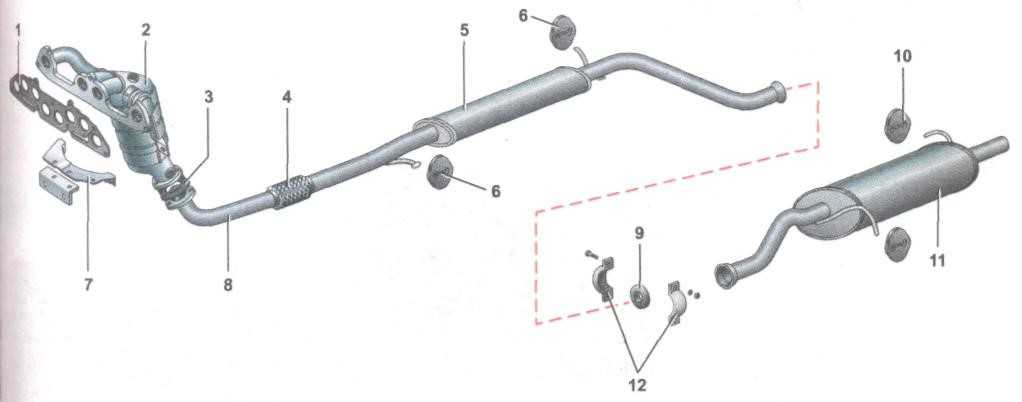 Система выпуска отработавших газов: 1 —прокладка; 2 — каталитический нейтрализатор; 3 — уплотнительная прокладка; 4 — виброизолирующая муфта; 5 — дополнительный глушитель; 6,