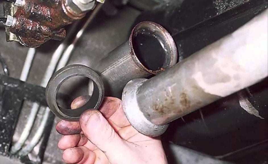 Герметичность соединения приемной трубы глушителя с каталитическим нейтрализатором можно восстановить заменой прокладки.