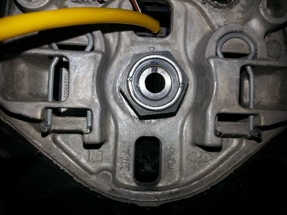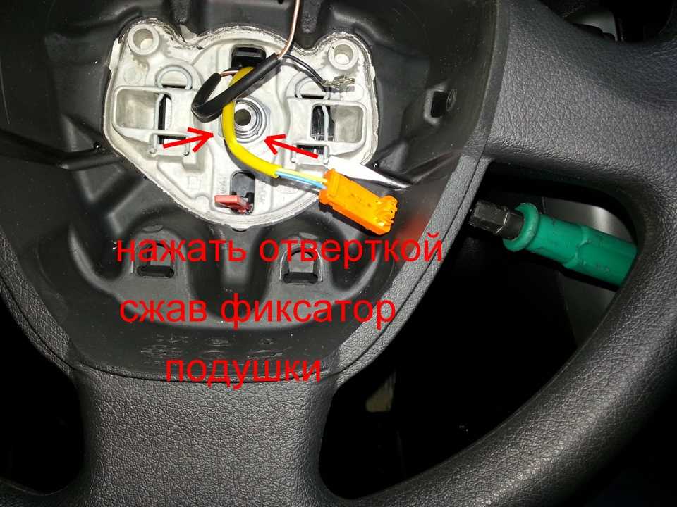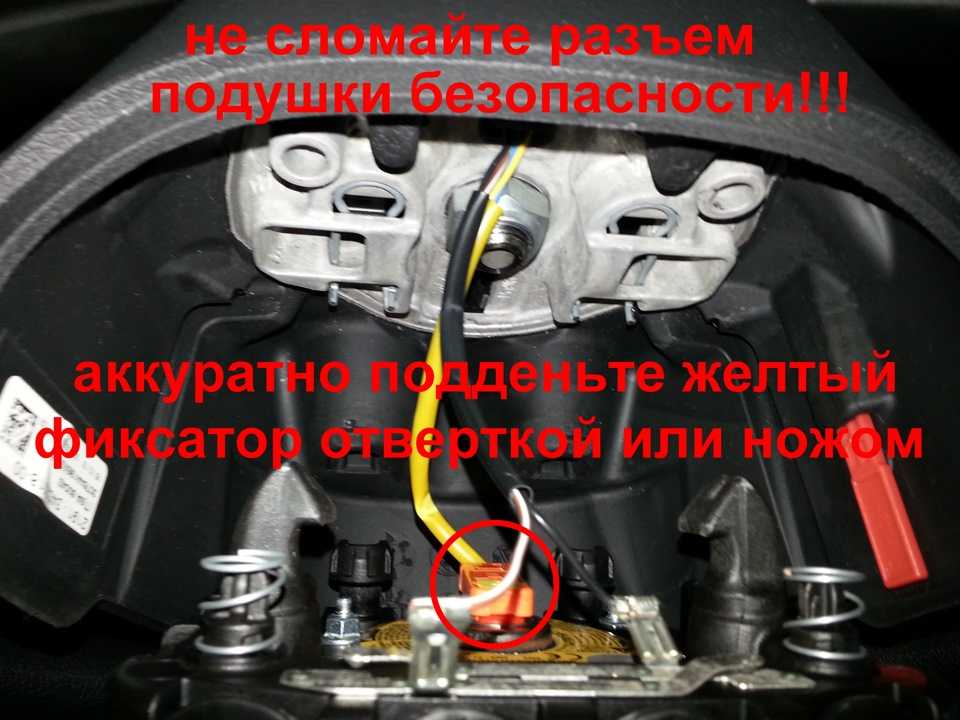 Он такой формы и материала, что от любых лишних усилий разлетается вдребезги. Внутри него не просто клеммы, а ещё какой — то дроссель (типа катушки). Отдельно этот кусочек проводки с разъемами не продаётся. Только вместе с блоком подрулевых переключателей.Так что учтите все вышесказанное, и не повторяйте ошибки других. Выполняйте все аккуратно и не торопясь.4. Освободив Подушку от всех креплений, аккуратно отодвиньте её от руля.
