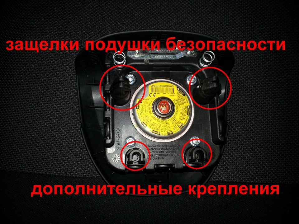 Одной рукой сдавливаем фиксатор, другой рукой тянем сбоку подушку на себя, до характерного щелчка. Если после отпускания отвертки подушка сама не садится на место, то защелка успешно освободилась.То-же самое нужно повторить с другой стороны, одновременно поддерживая первую сторону, т. к. она может опять защелкнуться.3. После этого необходимо вынуть нижние дополнительные крепления подушки. (изображены на фото аирбега выше)Крепления в посадке сидят довольно плотно. Вытащить их можно только сильно тянув снизу подушку на себя.