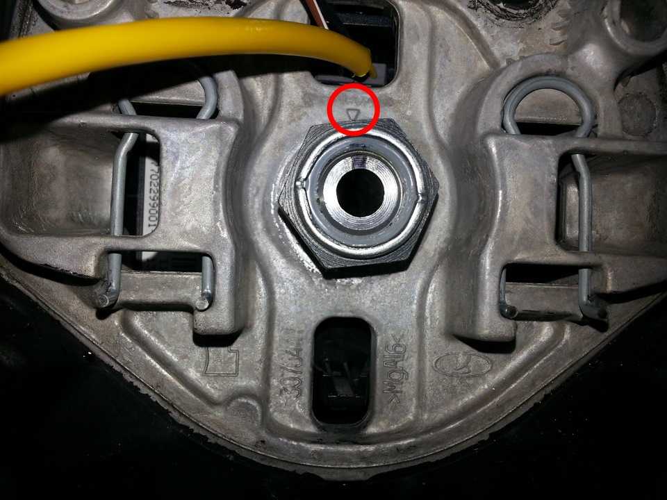 - Отметьте положение рулевого колеса по отношению к валу, нанеся метку на валу против треугольной метки на рулевом колесе