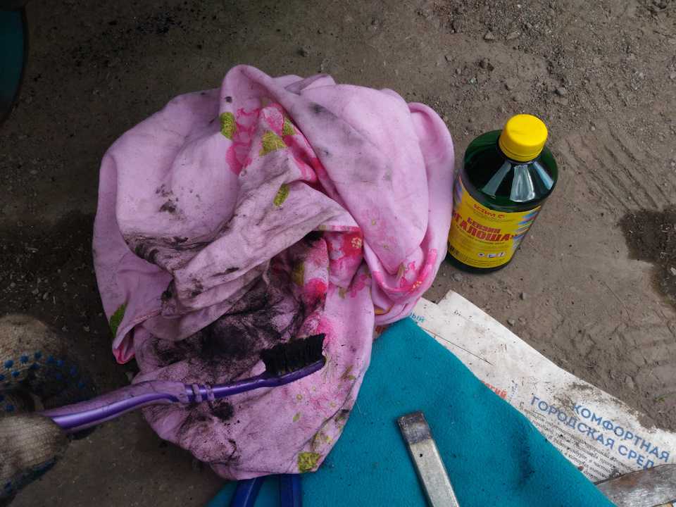 Потом у меня есть зубная щетка, бензин, тряпка. И начал все мыть.