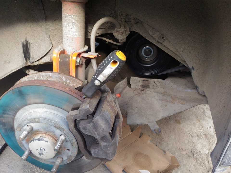 - если мотор расположен поперечно, то снимаем колесо и подкладываем что-то под тормозной диск вместо колеса;