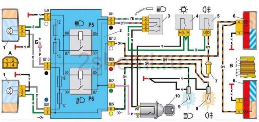 1 — блок-фары; 2 — монтажный блок 2104; 3 — переключатель света фар в трех-рычажном переключателе; 4 — переключатель наружного освещения; 5 — выключатель заднего противотуманного света; 6 — задние фонари; 7 — предохранитель цепи заднего противотуманного света; 8 — контрольная лампа противотуманного света, расположенная в блоке контрольных ламп; 9 — контрольная лампа дальнего света фар, расположенная в спидометре; 10 — выключатель зажигания; Р5 — реле включения дальнего света фар; Р6 — реле включения ближнего света фар; А — вид на штекерный разъем блок-фары: 1 — штекер ближнего света; 2 — штекер дальнего света; 3 — штекер массы; 4 — штекер габаритного света; Б — к клемме 30 генератора; В — выводы печатной платы заднего фонаря (нумерация выводов от края платы): 1 — на массу;2 — к лампе стоп-сигнала; 3 — к лампе габаритного света;4 — к лампе противотуманного света;5 — к лампе света заднего хода; 6 — к лампе указателя поворота.