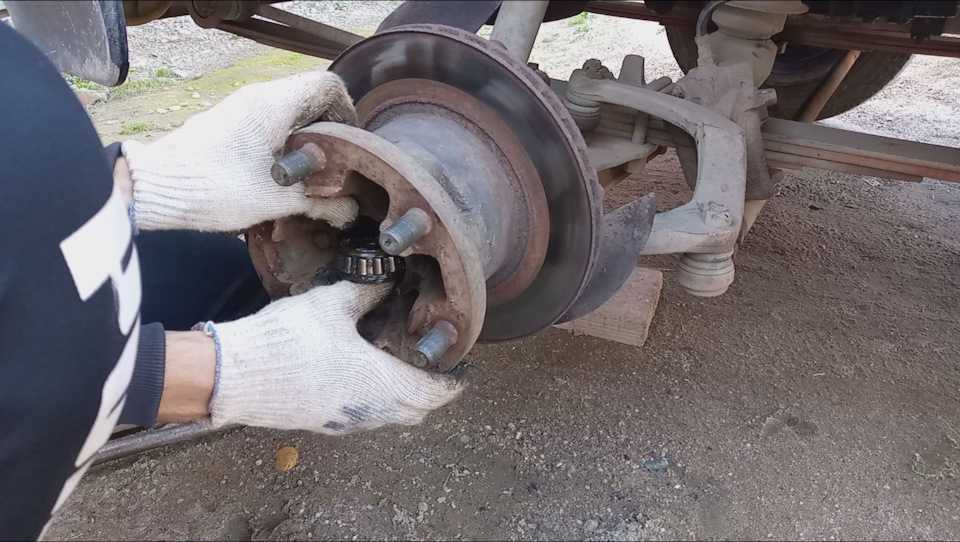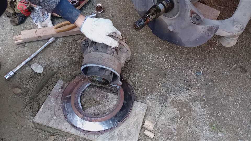 Осторожно придерживая наружный подшипник от выпадения, снимаем ступицу и тормозной диск