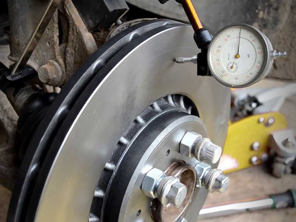 Измерение осевой деформации тормозного диска при помощи индикатора часового типа. Отклонение стрелки покажет, имеет диск «волну» или нет
