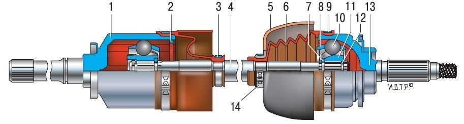Привод переднего колеса Шеви Нива: 1 – корпус внутреннего шарнира; 2 – фиксатор; 3 – хомут крепления чехла; 4 – вал привода колеса; 5 – защитный кожух чехла; 6 – защитный чехол; 7 – упорное кольцо обоймы; 8 – сепаратор; 9 – хомут; 10 – шарик; 11 – обойма наружного шарнира; 12 – стопорное кольцо; 13 – корпус наружного шарнира; 14 – хомут крепления кожуха. Крутящий момент на передние колеса передается от редуктора переднего моста через правый и левый приводы. Оба привода одинаковы по конструкции. Каждый привод состоит из вала 4 и двух шарниров равных угловых скоростей, установленных на его шлицевых концах. Корпус внутреннего шарнира 1 соединен с полуосевой шестерней редуктора переднего моста. Корпус наружного шарнира 13 соединен со ступицей переднего колеса. Обойма 11 соединена с корпусом 13 через шарики 10, которые расположены в пазах корпуса и обоймы. Обойма установлена на шлицы вала 4, упирается в кольцо 7 и зафиксирована на валу стопорным кольцом 12. В сжатом состоянии это кольцо свободно проходит через шлицевое соединение обоймы 11, что позволяет как соединять, так и разъединять шарнир и вал. Корпус внутреннего шарнира 1 отличается от корпуса наружного шарнира 13 тем, что имеет прямые пазы.