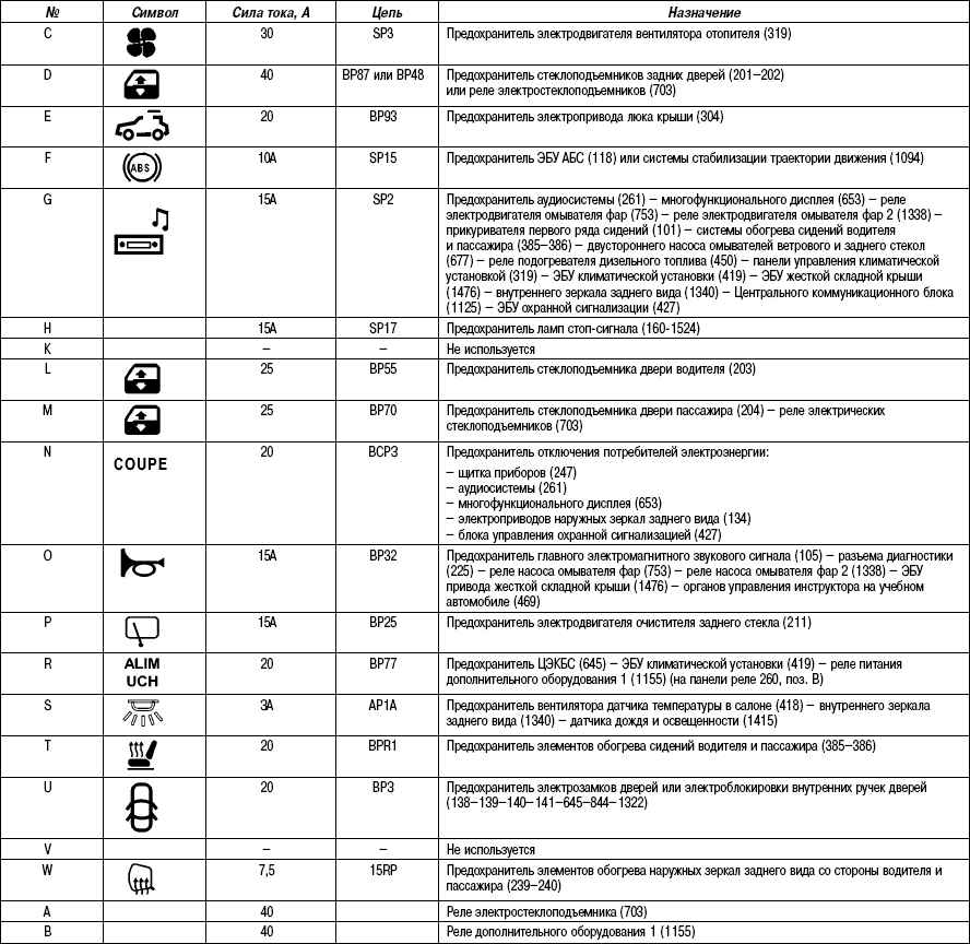 За большую часть оборудования несет ответственность предохранитель с обозначением BCP3 с ячейкой под номером 25. Рядом находится ВР77 (ячейка 20), который защищает полностью все электроприборы салона авто. Подробно назначение каждого элемента указано в таблице.