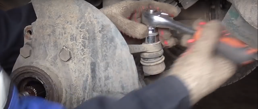 7. Открутите гайку на 22 крепления рулевого наконечника к поворотному кулаку: