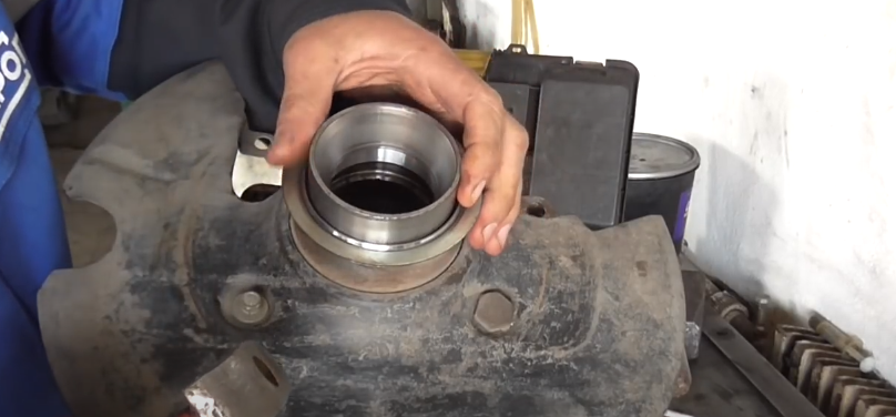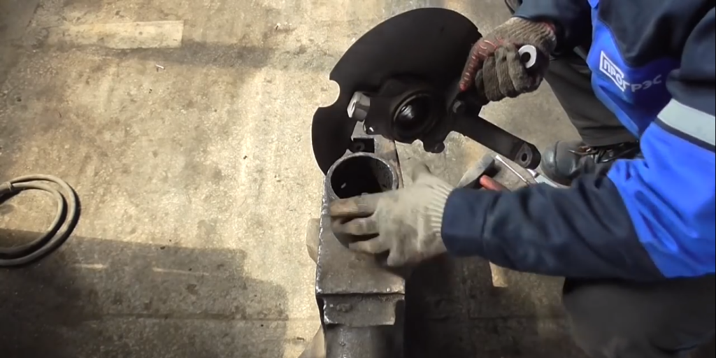 15. Очистите старое посадочное место от загрязнений и ржавчины. Запрессуйте обойму нового подшипника. В качестве оправки можно использовать обойму старой детали. Для этого можно зажать детали в тисках и постепенно прессовать деталь внутрь поворотного кулака или использовать пресс: