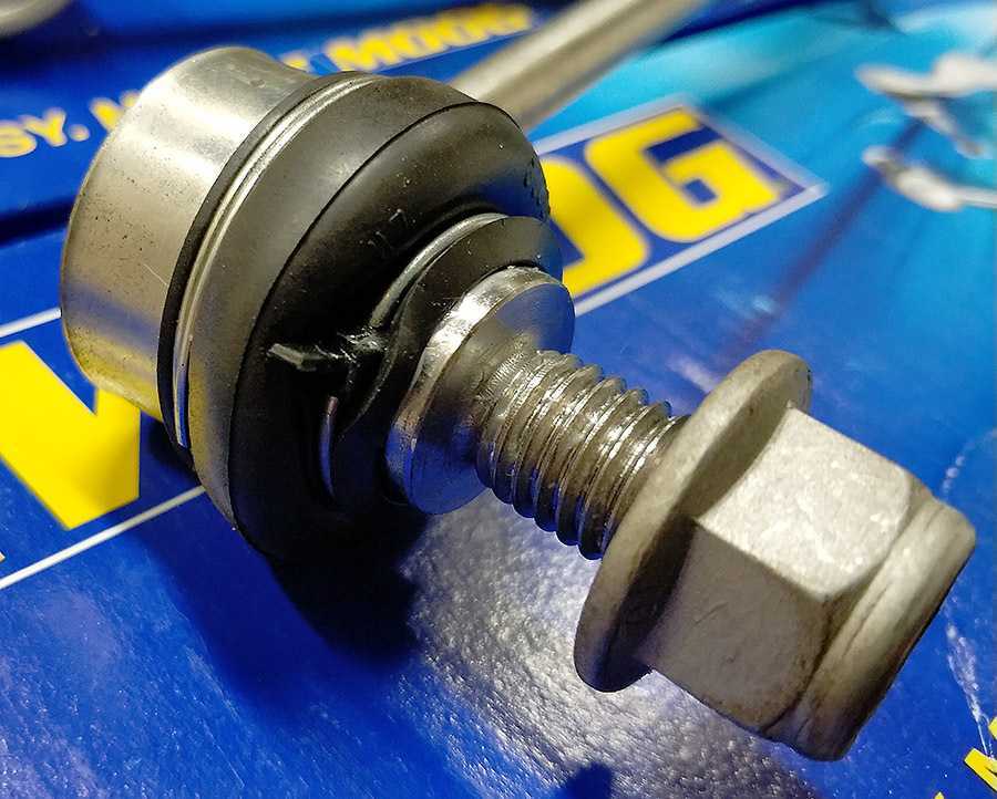 Долго выкраивал денёк чтоб тряхонуть подвеску. Амортизаторы протопевали уже года два как. А тут ещё заскрипели опорные подшипники. Дело осложнилось ещё и тем, что стойки стабилизатора поперечной устойчивости не захотели откручиваться от стойки амортизатора. Гайки крутились, но с большим трудом. С таким трудом, что (через несколько оборотов гайки на внешней резьбе) внутренний шлиц под Torx T30, за который нужно было удерживать ось от проворота, слизался до окружности. Попытки забить туда звездочку побольше или шестигранник, удержать ось ручной струбциной, нарезать на оси плоский шлиц удачи не принесли. Пришлось демонтировать жесткими методами — дремел, болгарка, гайколом. Ну, и ес-но, закупать новые стойки. Купил такие же, как и были — MOOG OPLS7446.