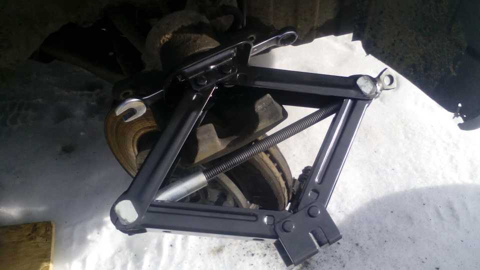 Если же не получается задвинуть поршень, то можно использовать обычный автомобильный домкрат. Скручиваем домкрат почти полностью и устанавливаем его как на фото. Своей нижней площадкой он упирается в поршень, а нижними ребрами в суппорт. Затем раскручиваем домкрат и поршень легко заходит на свое место.