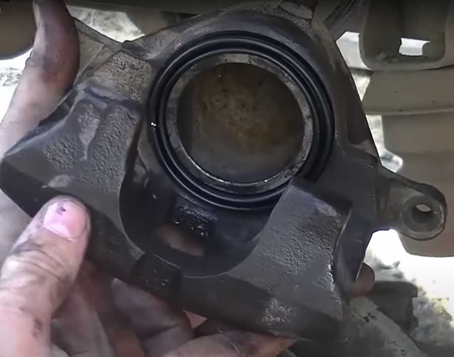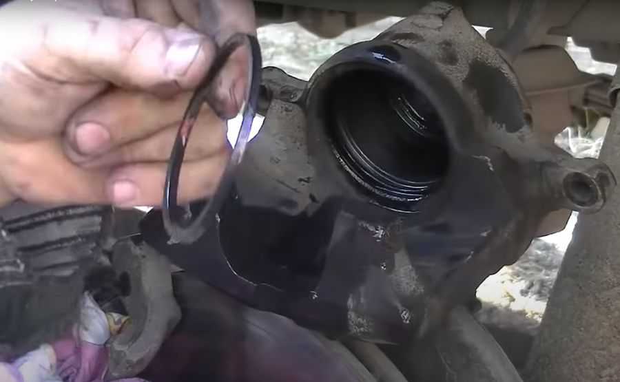 Если в процессе замены тормозных колодок были обнаружены потеки тормозной жидкости вокруг цилиндра или разрывы резинового пыльника, то обязательно меняем пыльник и резиновое уплотнительное кольцо, которое сидит в канавке внутри суппорта.