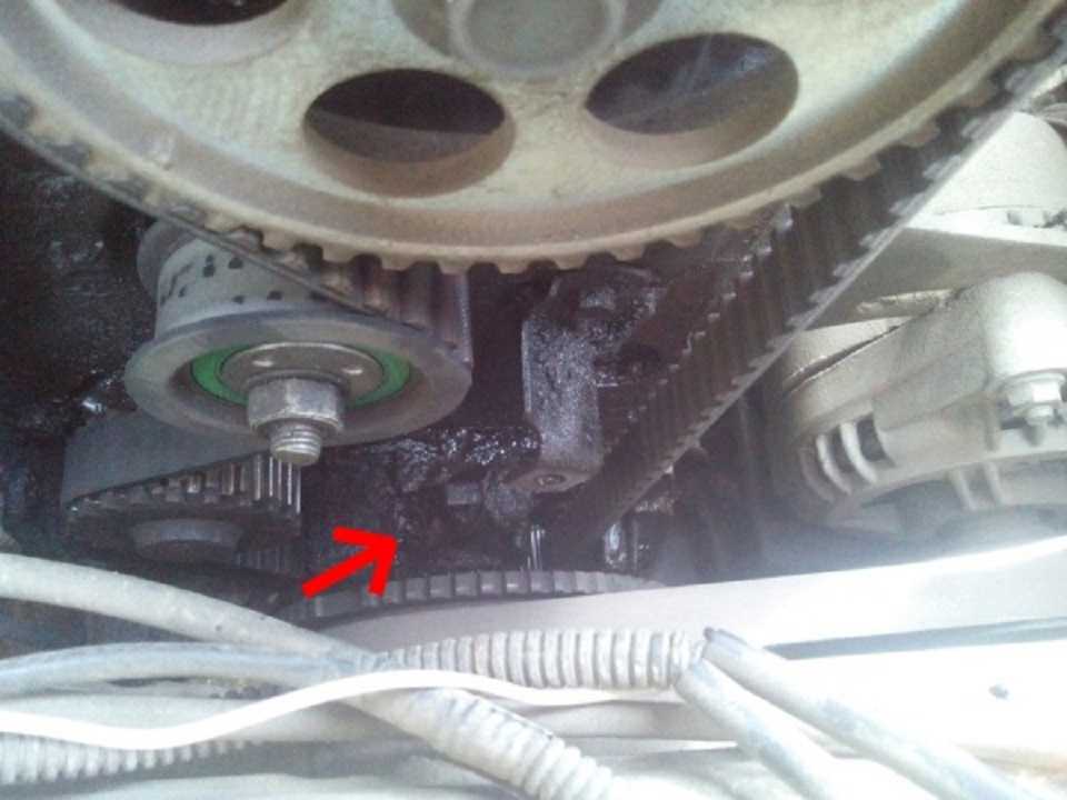 Течь устранена, все возвращается на место: шкив ГРМ с зубчиками (обе метки должны совпасть), устанавливается ремень ГРМ посредством натяжного ролика.