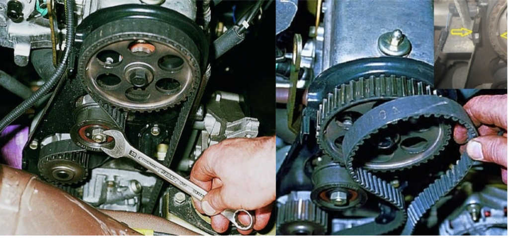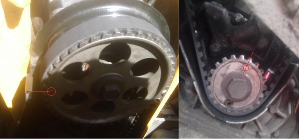 Перед этим они выставляются по отметкам, соответствующим расположению первого цилиндра в ВМТ (верхней мертвой точке) в сжатом состоянии. Отметки — шкивные и картерные — должны совпадать. На иных агрегатах на распредвальном колесе отметку нужно расположить напротив разъема блока и головки мотора. Такая регулировка необходима, чтобы циклы газораспределения работали правильно. Достаточно выставить только распредвальный ролик согласно метке.