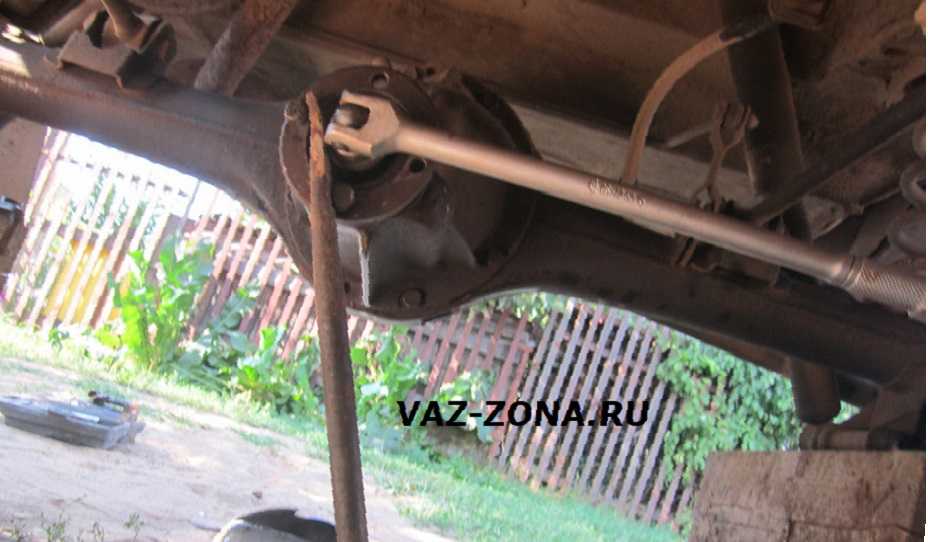 Загоняем авто на яму или эстакаду и сливаем масло с моста (не забываем сразу закрутить сливную пробку обратно). Делаем метку маркером в месте соединения кардана с редуктором (что бы не сбить балансировку во время установки). Берём ключ на 13 и крепкую отвёртку или какую-нибудь монтажку и откручиваем гайки, крепящие кардан к редуктору.