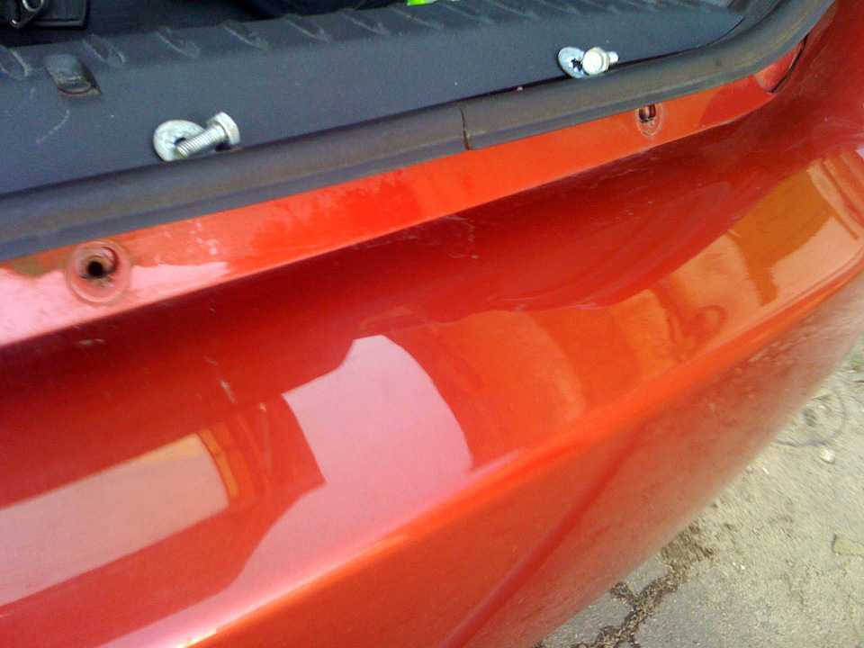 Откройте заднюю дверь Киа Спектра и найдите отверстия-штатные фиксаторы внутри задней части бампера. Они находятся непосредственно под задним фонарем и в боках бампера.
