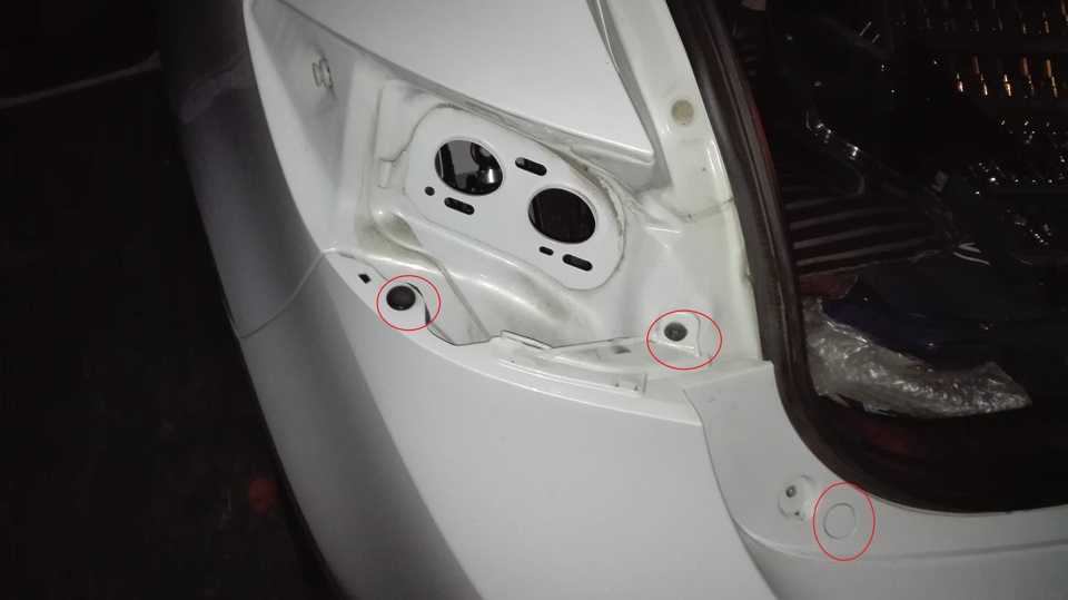 Снимаем болты крепления к заднему крылу и колесной арке. Снимаем накладку багажника. В багажнике поднимаем коврики и крышки технологических отверстий – под ними крепления к днищу, их тоже необходимо снять. Снимаем задние фонари. Далее снимаем номерной знак и кронштейн. Откручиваем гайки крепления к верхней части кузова из багажника